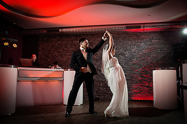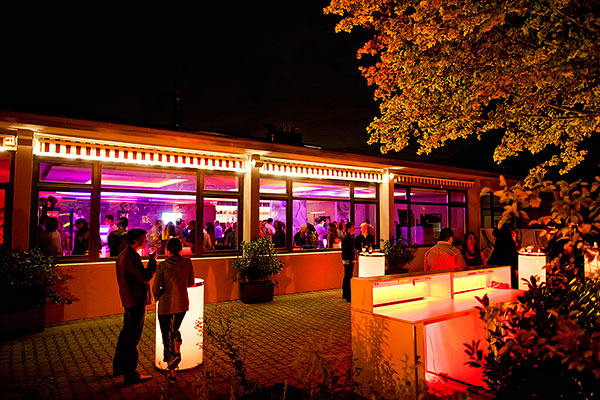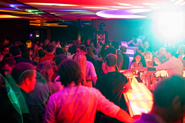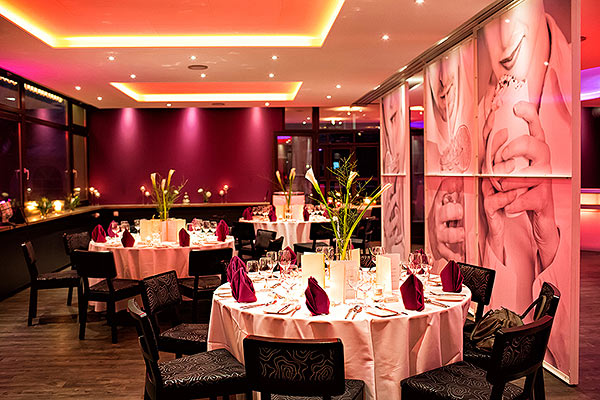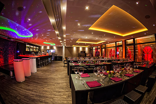Mit warmen Farbtönen, variablen Lichtsituationen und dunklen Holzmöbeln spiegelt sich hier der moderne Loungecharakter wieder. Die illuminierte Bar ergänzt den individuell großen Tanzbereich.