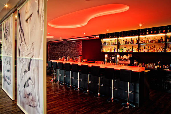 Leckere Cocktails und feine Spirituosen – und eine stilvolle Bar um dies zu genießen. Auch als Empfangsbereich für Veranstaltungen prima geeignet.